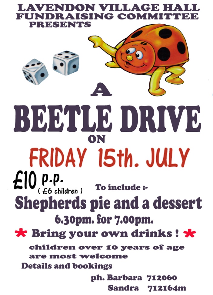 15th July: Beetle Drive at Lavendon Village Hall Beetle Drive at Lavendon Village Hall Share this: Click to share on X (Opens in new window) X Click to share on Facebook (Opens in new window) Facebook Like Loading... Related