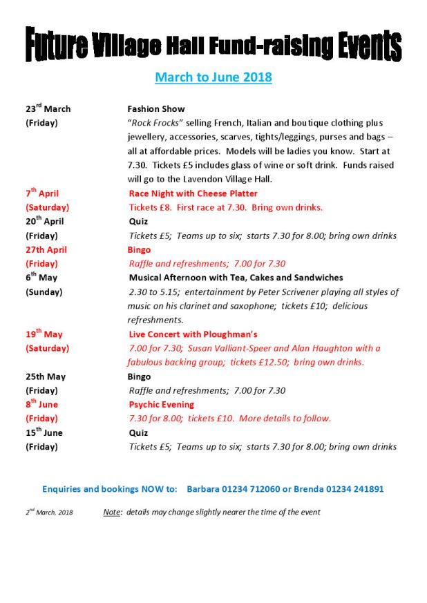 Lavendon Village Hall Fundraising Events, March-June 2018 Lavendon Village Hall Fundraising Events March/June 2018