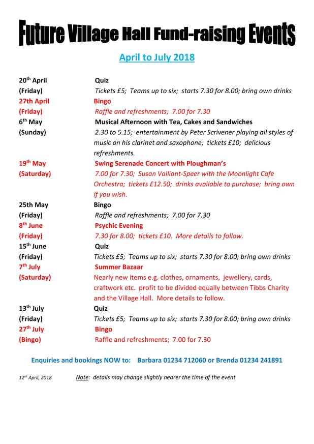Lavendon Village Hall Fundraising Events, April-July 2018
