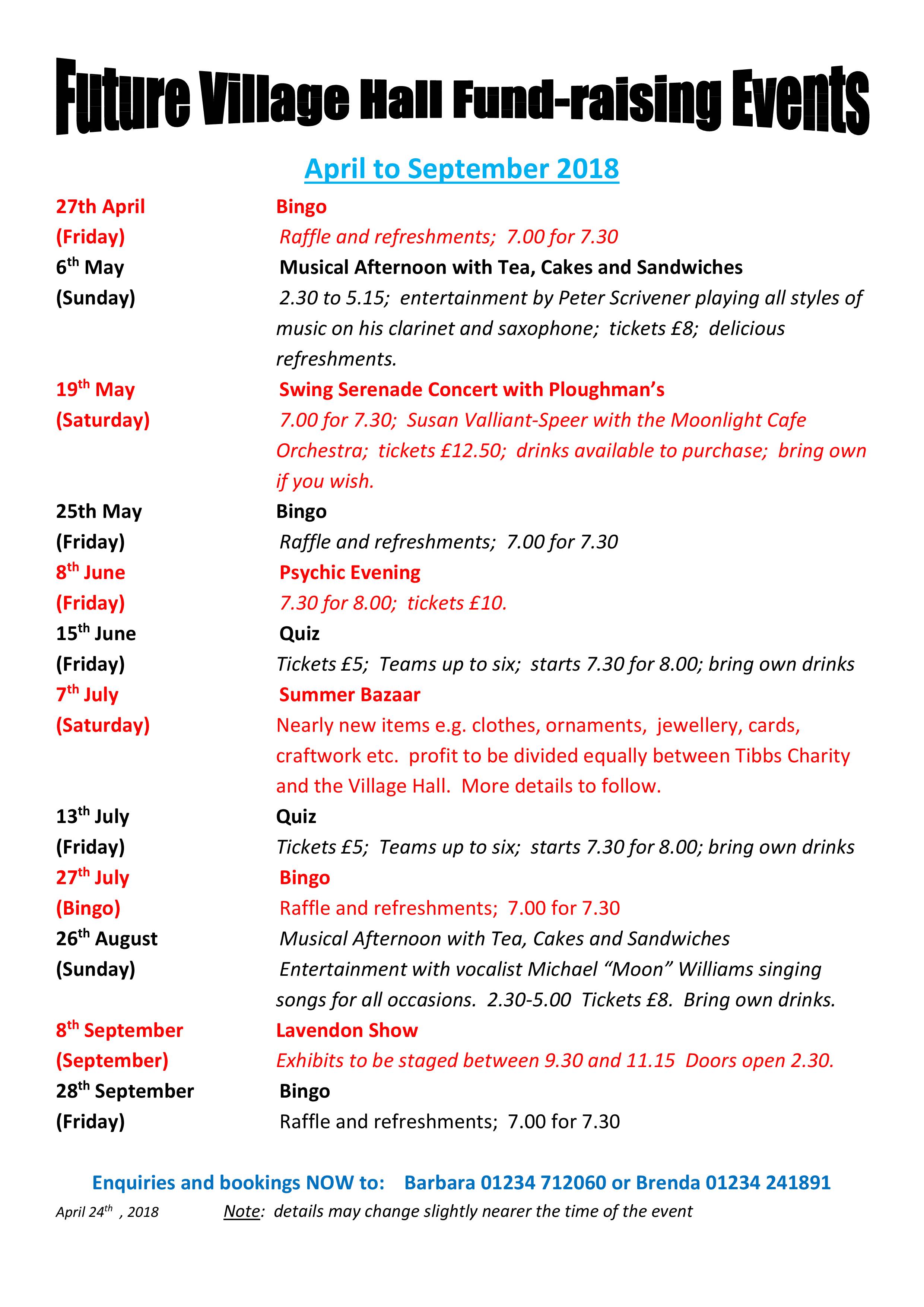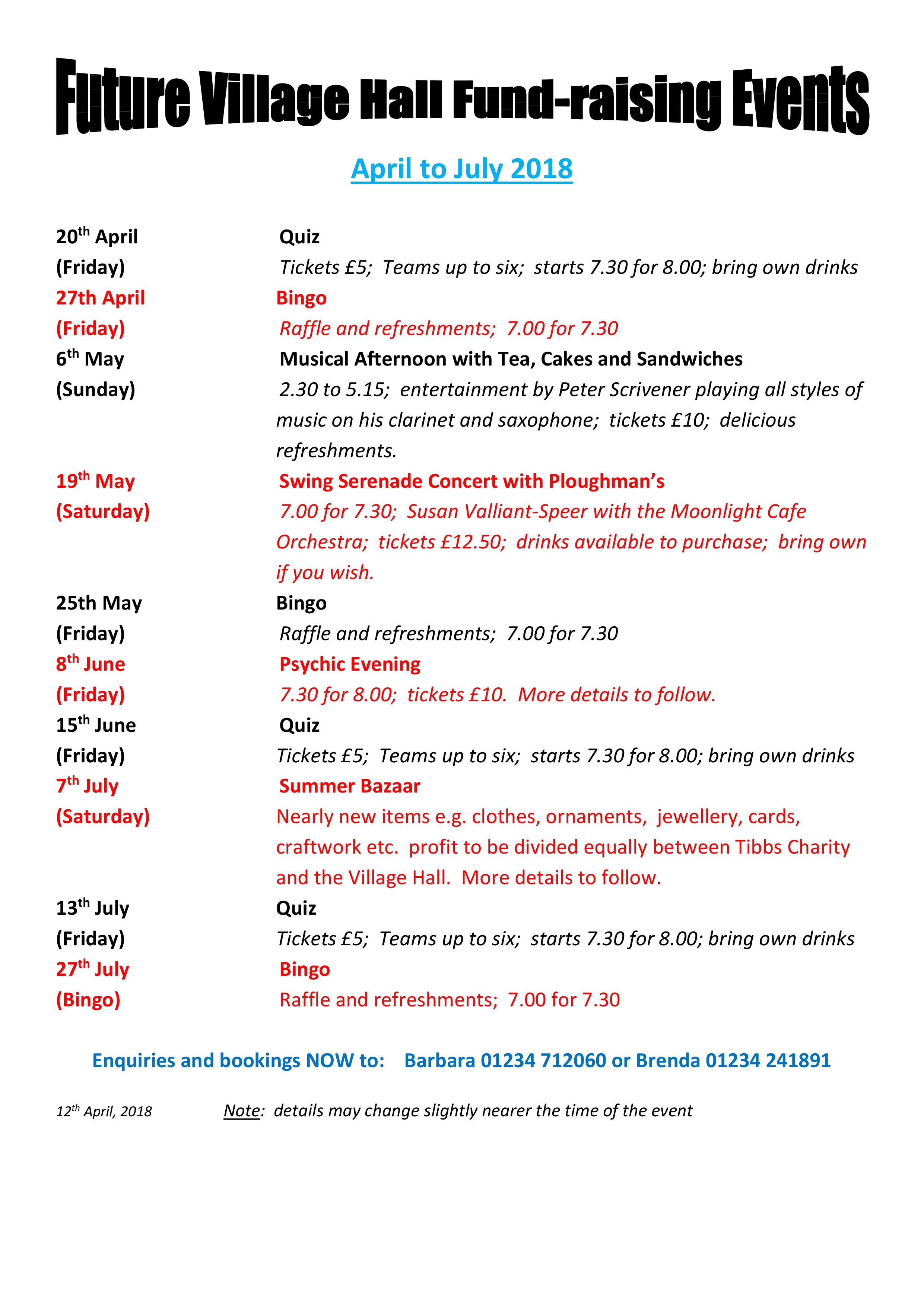 Lavendon Village Hall Fundraising Events, April-July 2018