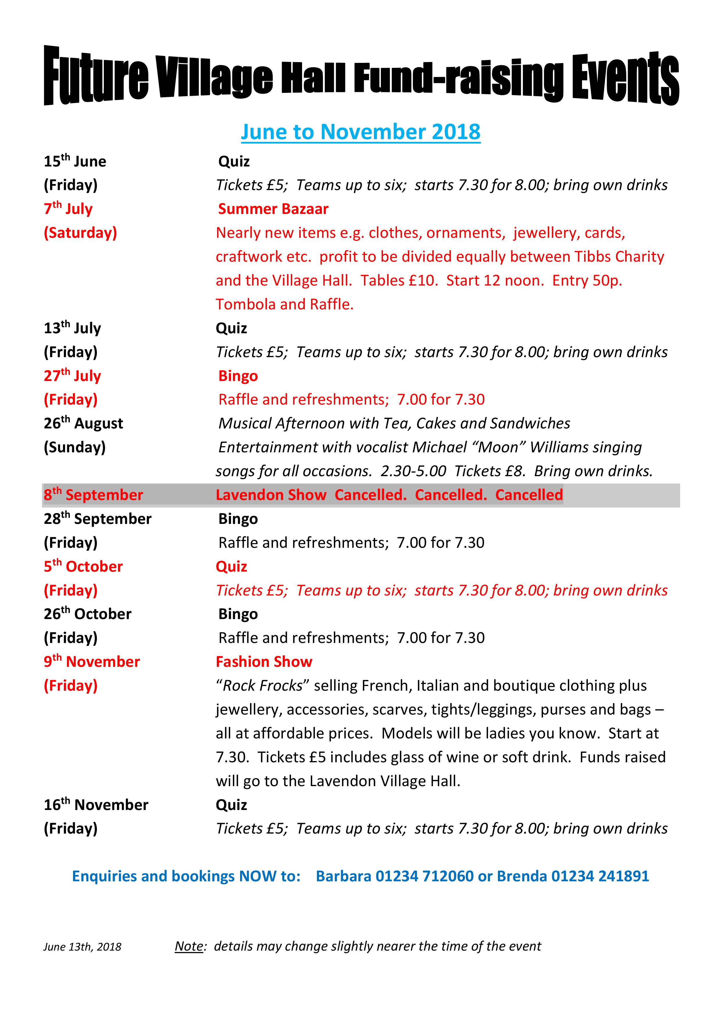 Lavendon Village Hall Fundraising Events, June-Nov 2018 Lavendon Village Hall Fundraising Events, June-Nov 2018