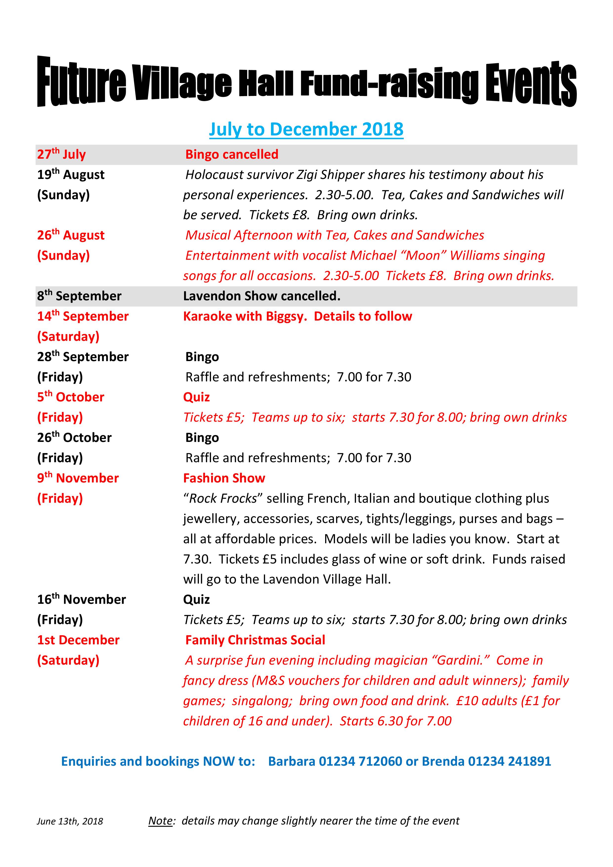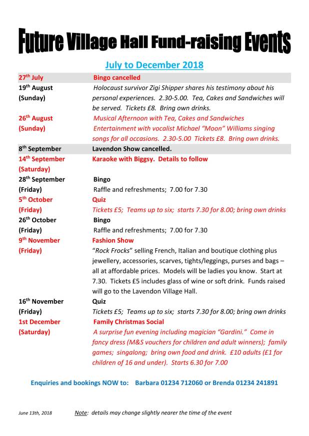 Lavendon Village Hall Fundraising Events: July-Dec 2018 Lavendon Village Hall Fundraising Events: July – December 2018