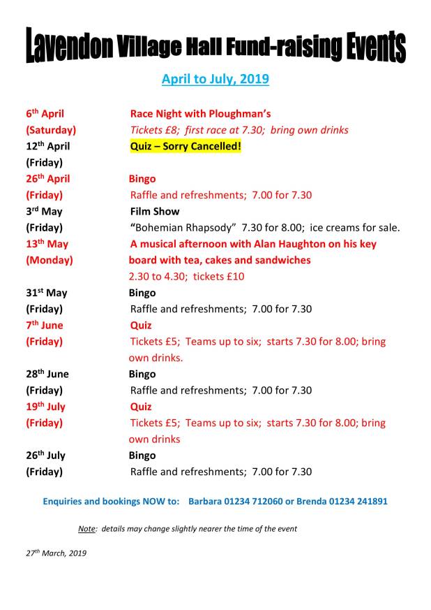 Lavendon Village Hall – Fundraising Events Apr-July 2019 Lavendon Village Hall Fundraising Events April-July 2019