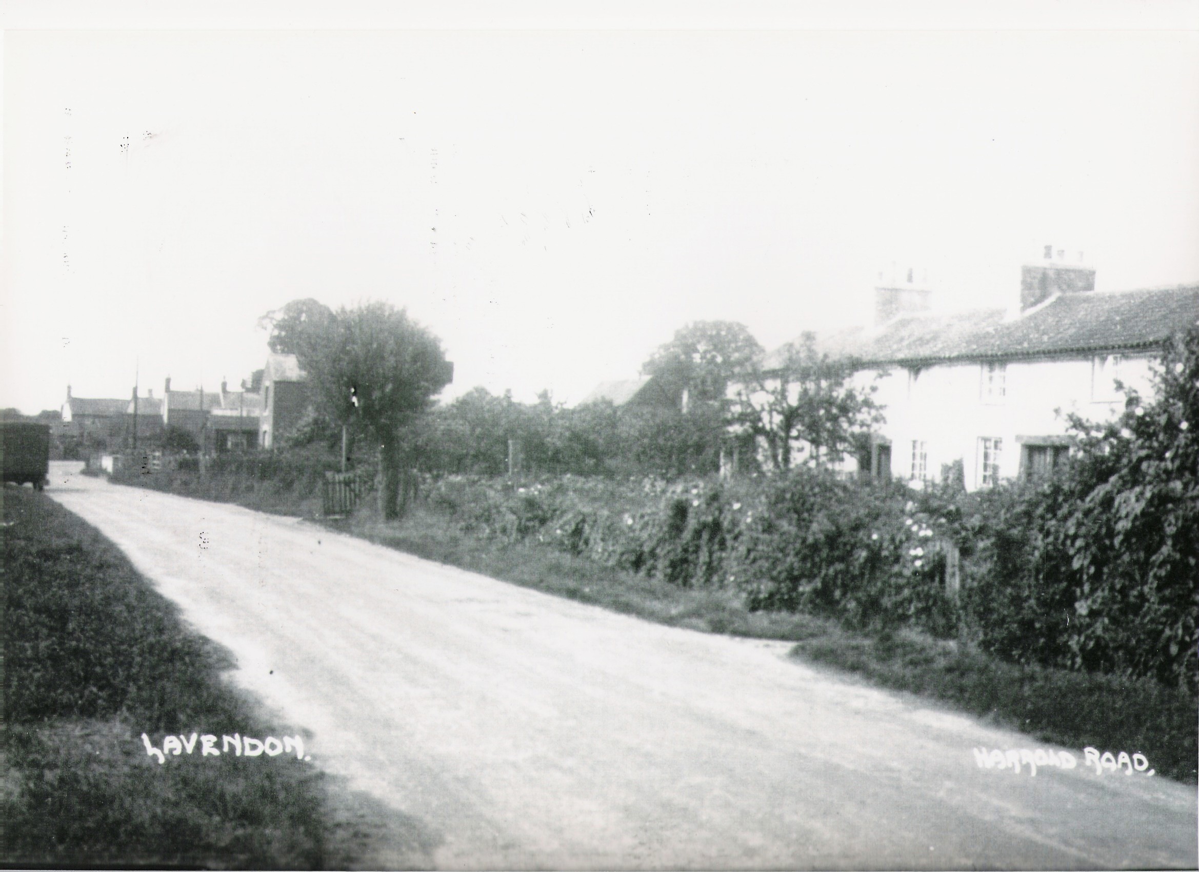 The following views show Harrold Road as it was before the footpath was installed in the late 1970s, a little after the original phase of ‘The Glebe’ was built. The entrance to the latter would now be where the gate is visible on the right in the first view shown below. The narrowness of the entrance to Harrold Road is also evident in this first view; this was so until the demolition of the adjoining cottages at the foot of Harrold Road took place circa 1954.