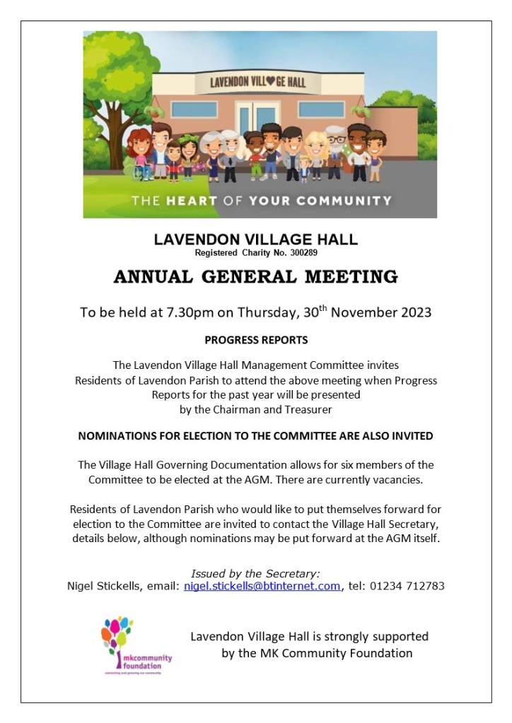 Each year in November the Lavendon Village Hall Management Committee is obliged to hold a public AGM when the Annual Reports of progress are given by the Chairman and Treasurer of the Committee. The latter includes representatives of village organisations and up to six elected members from the community. The Village Hall has excellent up-to-date facilities and equipment, and is thriving financially. However, there are at least three vacancies on the Committee for Lavendon residents who would like to assist with putting forward ideas for the Hall’s management and/or associated community events. The Committee typically meets once a month, for an hour or so in an evening, and is friendly and informal in nature. You are warmly invited to come along to the AGM on 25th November, hear about what’s going on, and see whether you might like to join us in managing the future of the Hall and in developing its valuable social role within the community. More details are shown in the attached poster. Do come along to find out more, even if you don’t wish to join the Committee!
