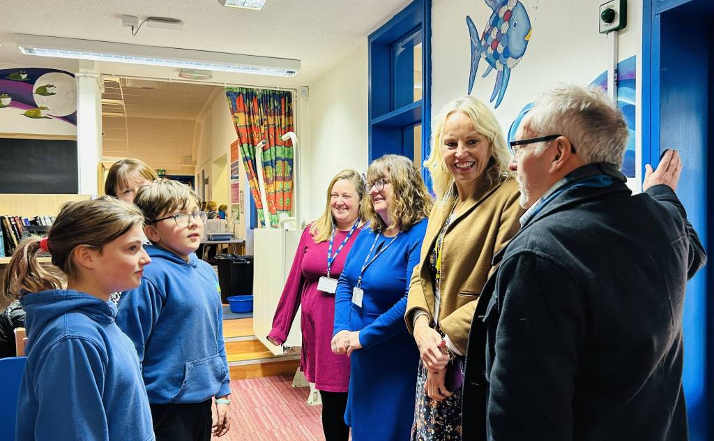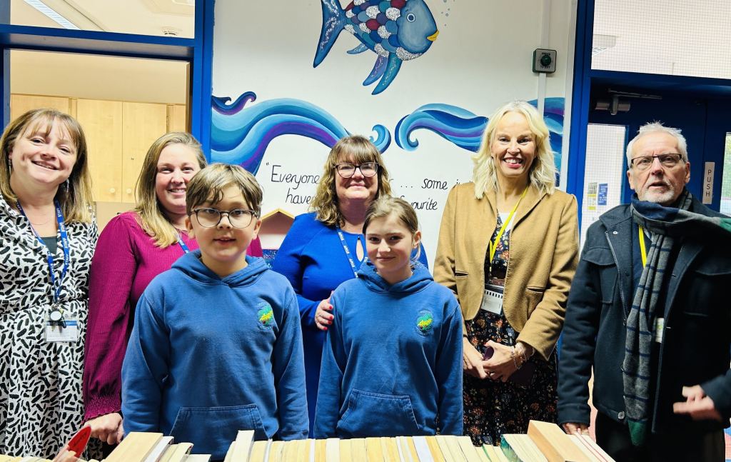 Above: Mike Griffiths, Chair of Governors; Lisa Watson, Head Teacher; and Sarah Bennett, CEO of IFtL. Also: Clare Crook, SENCo and SLT; Hannah King, Deputy Head Teacher, together with pupils.