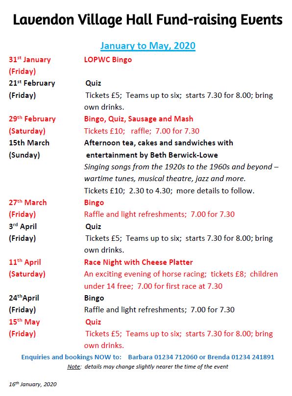 Lavendon Village Hall Management Committee normally holds an AGM during November of each year. This is an opportunity to present the Chairman’s and Treasurer’s Reports for the financial year ending 30th September, and to elect a new Management Committee that includes local organisational representatives plus six directly elected members.