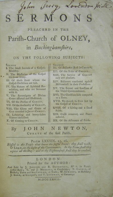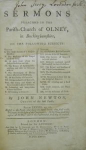 It is evident from the foregoing that the Perrys were pillars of Lavendon society and also religious men. Some further evidence of the latter comes from the recent sale of a book of ‘Sermons Preached in the Parish Church of Olney’ written by John Newton ‘of the said parish’. A copy of the title page is shown here bearing John Perry’s name which would likely be either that of James’ father or his grandfather given that the book was published in 1767.